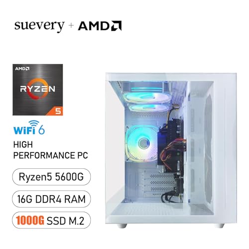 Gaming PC AMD Ryzen5 5600G 6Cores 3.9GHz UP to 4.40 GHz 16GB DDR4 RAM 1Tb SSD, AMD Radeon Vega7 Graphics 600W Windows11 Home WI-FI Prebulilt Desktop Computer White